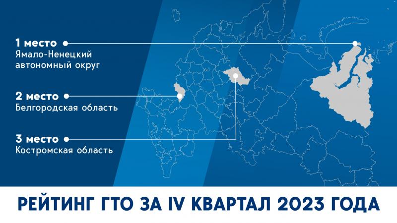 Впервые в истории Рейтинга ГТО Ямало-Ненецкий автономный округ занял лидирующую позицию. На второе место в рейтинге вышла Белгородская область, подтвердив стабильный уровень развития комплекса «Готов к труду и обороне» в регионе. Поднявшись на шесть строчек вверх, Костромская область сделала рывок вперёд, замкнув тем самым тройку лидеров.